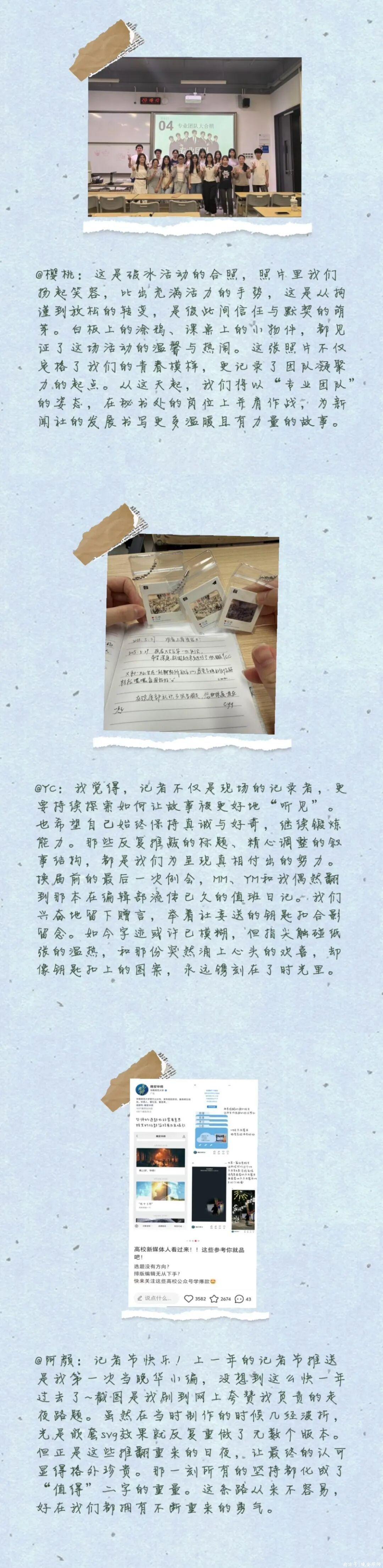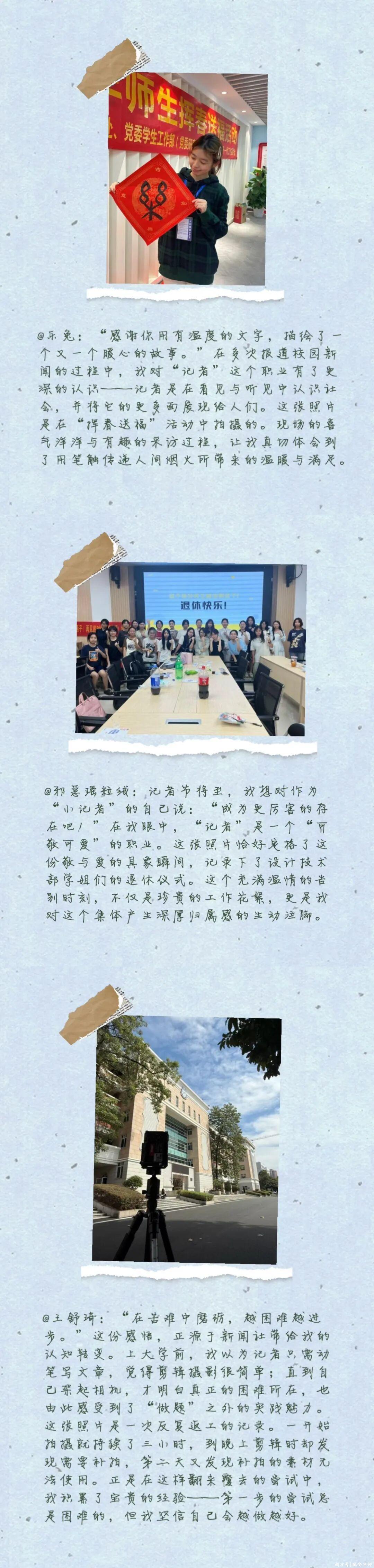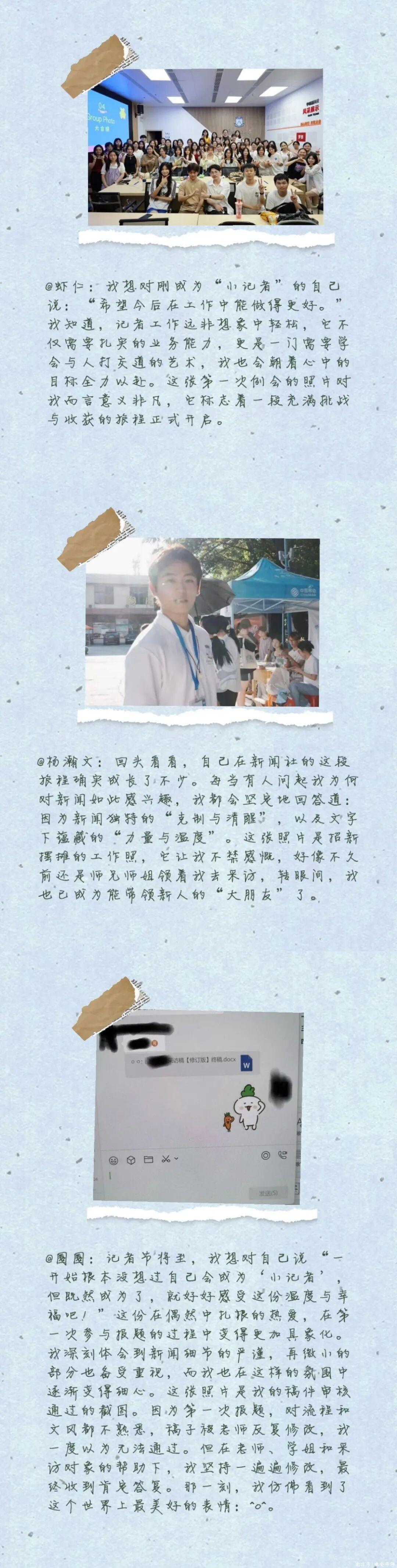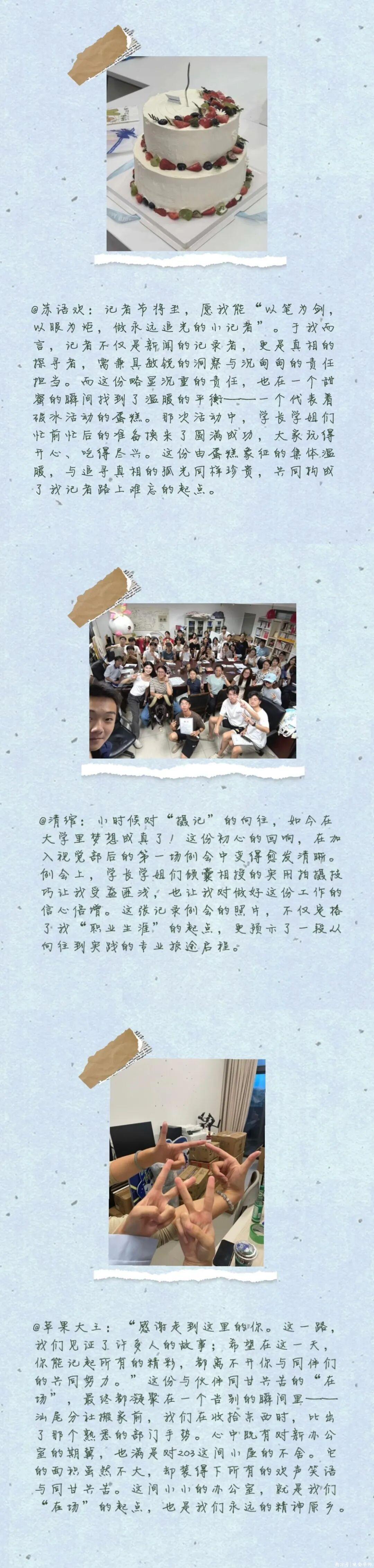 与挑战并行的是成长。在日常的工作中,陈满乐对新媒体部的认识日益深入:从最初自嘲的“小裁缝”,逐渐转变为推文美感和传播力的守护者。随着工作逐渐得心应手,成为骨干后的他也能将心比心,积极为新社员提供帮助。如今在新的部门工作,原先积累的经验以及与小伙伴们并肩作战的情谊,成为他前进的助力。陈满乐坚信,无论是在新闻社还是更广阔的天地,新闻人的使命是让“每一份心声都不被淹没,让每一份平凡都能发光”。